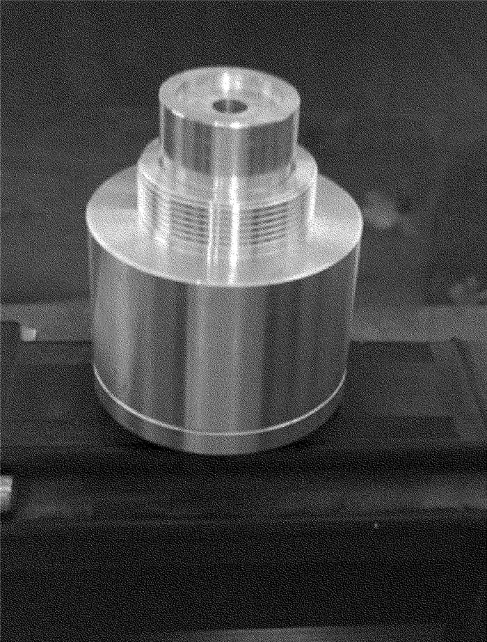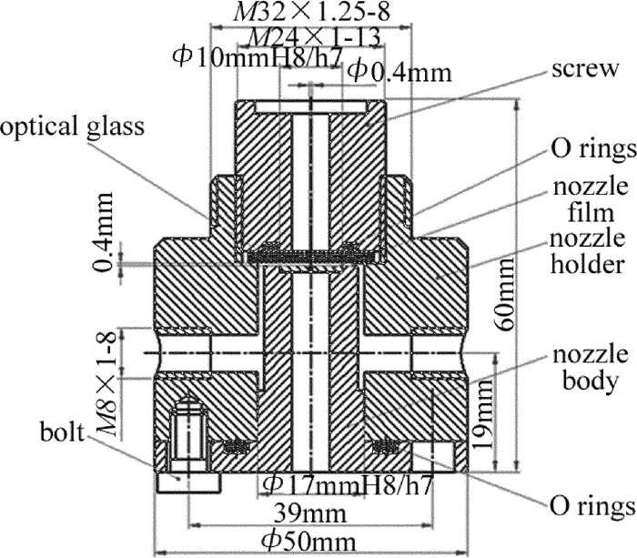 耦合裝置是實(shí)現(xiàn)激光與微水束耦合并傳輸?shù)年P(guān)鍵部件。耦合裝置主要由噴嘴體、進(jìn)水孔、O型圈、噴嘴支架等組成,如圖 2所示。本文中將噴嘴設(shè)計(jì)成圓柱形,目的是為了延長(zhǎng)微水束的破碎長(zhǎng)度。考慮到激光的能量密度比較大,且激光要在噴嘴內(nèi)部發(fā)生全反射,故噴嘴材料選用耐熱性比較好的銅。各參量具體數(shù)值為:噴嘴長(zhǎng)度為10mm,噴嘴直徑為0.4mm,耦合間隙為0.4mm。噴嘴體頂部的定位圓柱體6與噴嘴支架4通過螺紋連接,高壓水從左右兩側(cè)的注水口注入耦合裝置,并進(jìn)入噴嘴體與光學(xué)玻璃之間形成的耦合間隙,然后通過噴嘴片上的噴嘴將耦合之后的光液高能束噴射出來(lái)。圖 3為耦合裝置的實(shí)物照片。